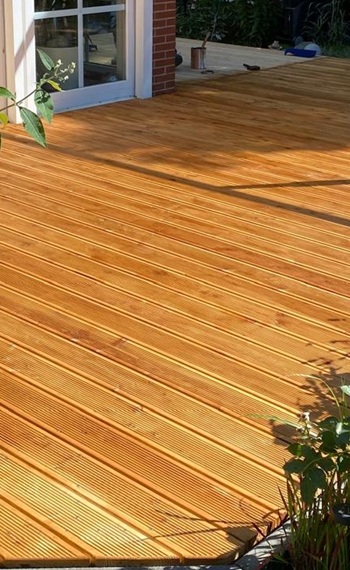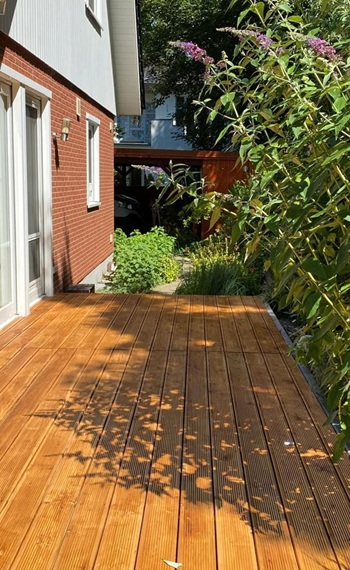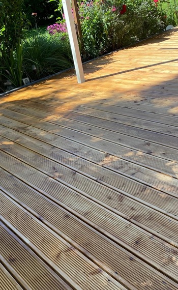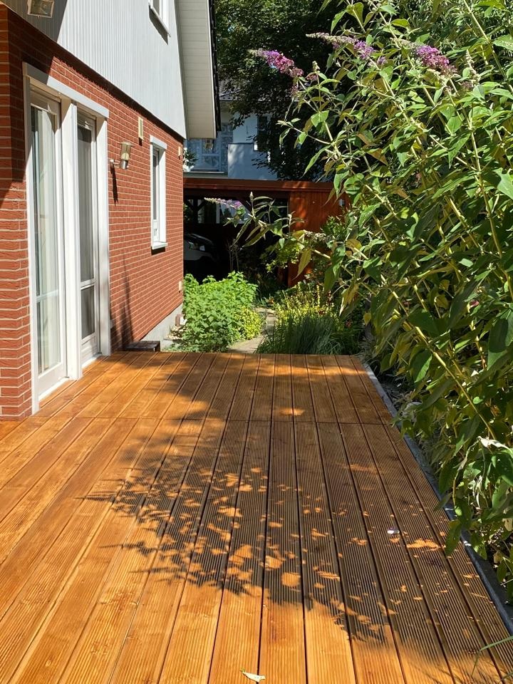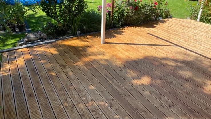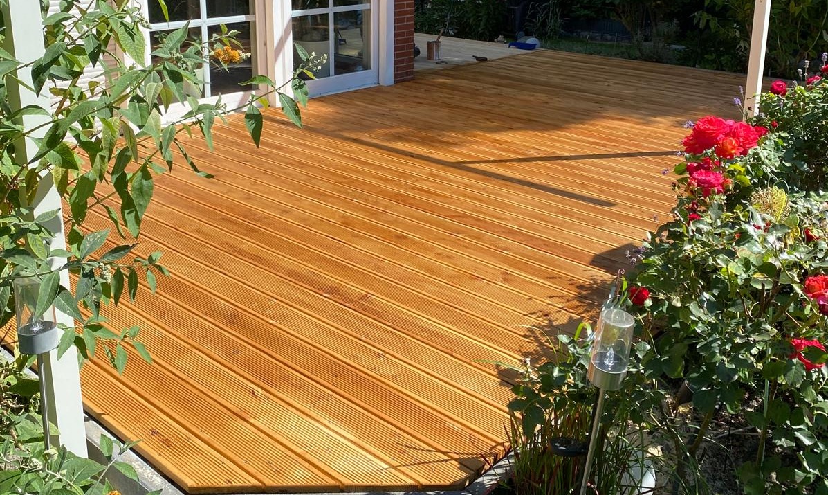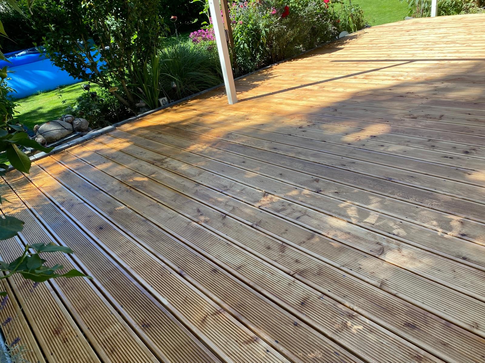 Damit Ihre Terrasse dauerhaft geschützt bleibt, beraten wir Sie gern zur richtigen Pflege. Mit hochwertigen Holzölen und Wachsprodukten lässt sich das Holz vor Witterungseinflüssen schützen und seine natürliche Optik erhalten.