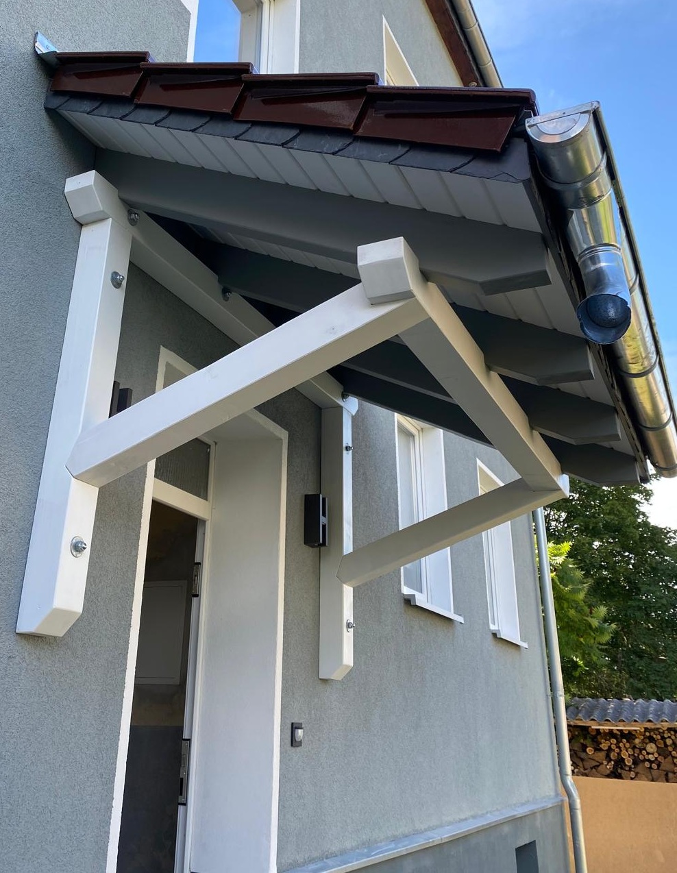 So fügt sich das Vordach harmonisch in den Eingangsbereich ein und erfüllt zuverlässig seinen Zweck.